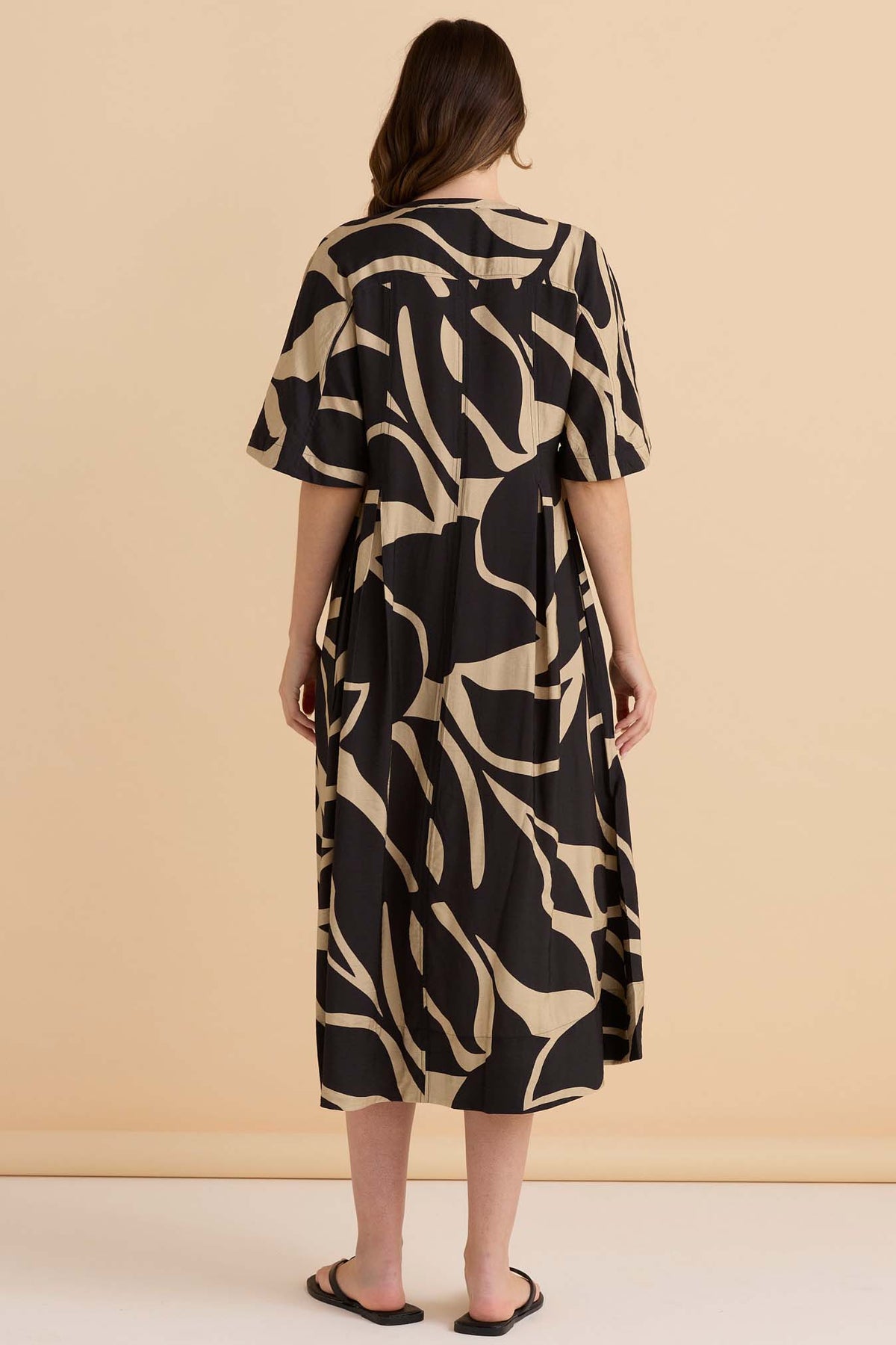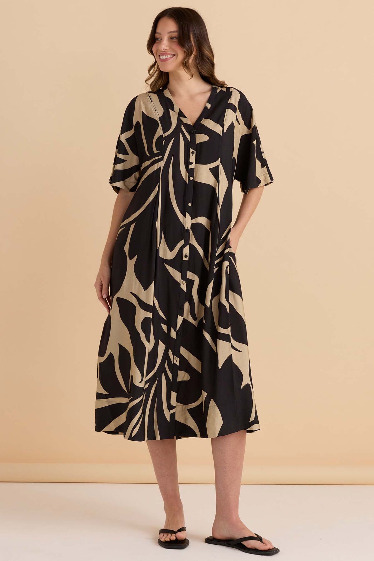 The true shirt dress styling adds subtle structure, while the monochrome floral print keeps the look bold yet timeless. It’s statement enough to stand alone, yet neutral enough to wear season after season.